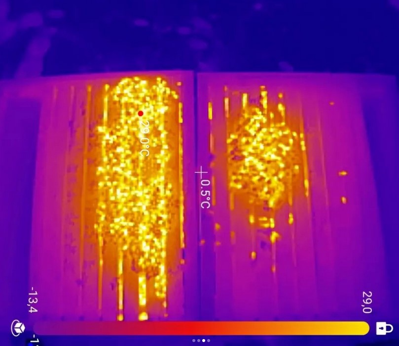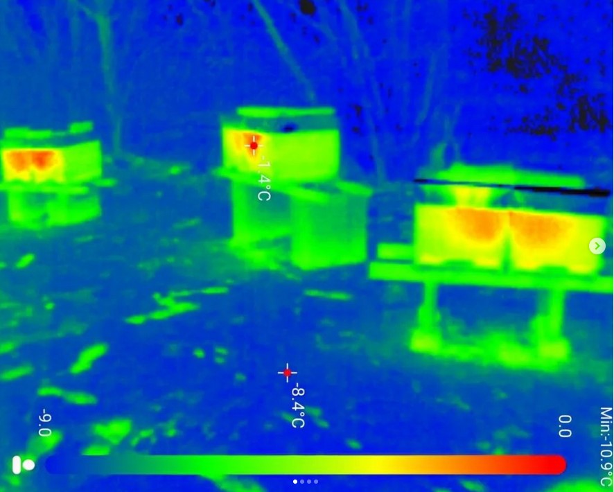 Die "Heizerbienen" haben viel zu tun in diesen Tagen. Sie sorgen auch bei Minusgraden für wohlige 25°C in der Wintertraube. Die Bienen bilden eine Kugel, die optimale, energieeffizienteste geometrische Form für diesen Zweck. Seite an Seite wärmen sich die Völker gegenseitig und sparen so Treibstoff.