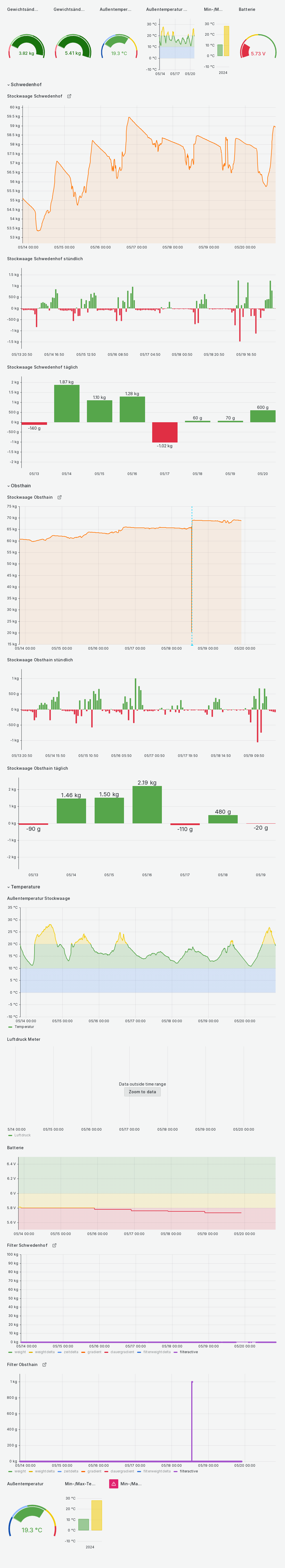 Trägt das Bienenvolk Nektar und Pollen ein? Haben die Pflanzen aufgehört nennenswerte Mengen Nektar abzusondern? Bietet die Natur noch genügend Futter? Ist das Bienenvolk stark oder eher ein "Schwächling"? Um welche Uhrzeit beginnen die Bienen auszufliegen? Solche Fragen und einige mehr lassen sich durch die Beobachtung des Stockgewichtes beantorten.